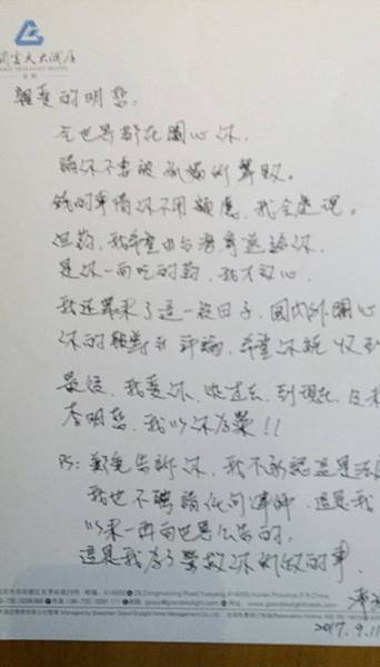 全世界都在關心你。請你不要被孤獨所擊敗。錢的事情你不用顧慮,我會處理。但藥,我希望由台灣寄送給你,是你一向吃的藥,我才放心。我還帶來了這一段日子、國內外關心你的報導和評論,希望你能收到。最後,我愛你,從過去,到現在,及未來,李明哲,我以你為榮!!