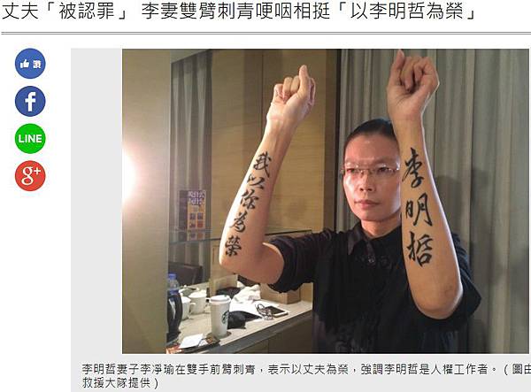 分享丈夫「被認罪」 李妻雙臂刺青哽咽相挺「以李明哲為榮」到Facebook 分享丈夫「被認罪」 李妻雙臂刺青哽咽相挺「以李明哲為榮」到Line 分享丈夫「被認罪」 李妻雙臂刺青哽咽相挺「以李明哲為榮」到Google+