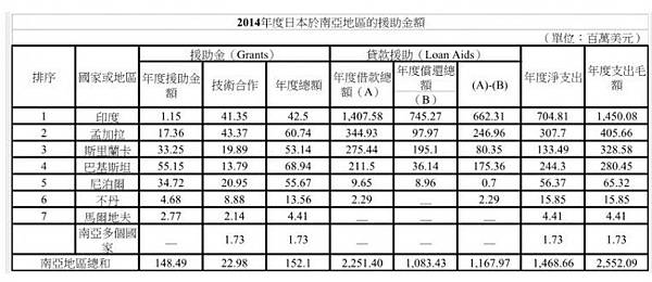 *此表格依據《2015 年發展合作白皮書》第 136 頁所提供之「日本援助南亞地區金額表」修改而成