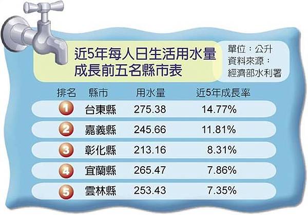 依近5年用水量成長統計,全台22縣市成長最兇的是東部的台東縣,增加15%最多。其次為嘉義與彰化,也各增11.8%與7.8%。人口最多的新北市,增幅只排13名,但也增加了2.9%。總計22縣市只有台北、高雄與連江三區有微幅下跌,但北高減幅都不到0.5%。而台北仍是全台用水量最高縣市,每人日均用水量仍超過333公升。