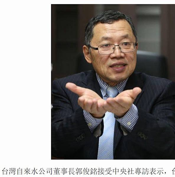 台灣自來水公司董事長郭俊銘接受中央社專訪表示,台灣在智慧水表的開發進度上,算是全世界前10名,加上台灣資通訊產業發達,具有優勢,已親自拜訪聯發科、研華科技等國內大廠,盼合作切入產業商機。 圖/中央社