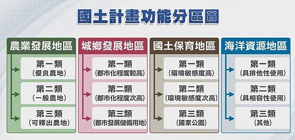 躺了20多年的《國土計畫法》,終於在今晚10點15分三讀通過。《國土計畫法》將台灣土地分為國土保育地區、 海洋資源地區、 農業發展地區 、城鄉發展地區,未來若要變更分區使用,必須透過中央通盤檢討,農地變更成建地將更嚴謹,避免浮濫變更和土地徵收,防止下一個苗栗大埔案發生。(重點法條內容整理請見文後)