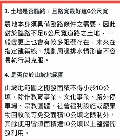 因此民眾有意辦理土地變更使用的話,可以先檢視農地位置及條件是否屬於上述情況,意即農地在非環境敏感區、非特定農業區、有臨路且路寬達到6公尺寬、未位於山坡地範圍(或3級坡以內),才具備變更的基礎條件,否則開發規劃上將受到諸多限制