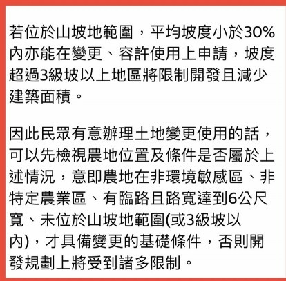 若位於山坡地範圍,平均坡度小於30%內亦能在變更、容許使用上申請,坡度超過3級坡以上地區將限制開發且減少建築面積。