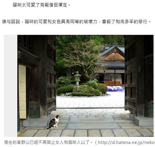 現在的高野山已經不再禁止女人和貓咪入山了。(http://d.hatena.ne.jp/neko-nikki/20150613/1434284619)