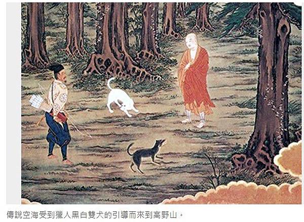 傳說空海受到獵人黑白雙犬的引導而來到高野山。(http://heartshuppan.sblo.jp/article/105724627.html)