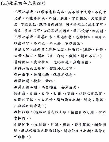 凡預此集者,以孝弟忠信為本。其不順於父母,不友於兄弟,不睦於宗族,不誠於朋友,言行相反,文過飾非者,不在此位。既預集而或犯,同志者,規之;規之不可,責之;責之不可,告於眾而共勉之;終不悛者,除其籍。