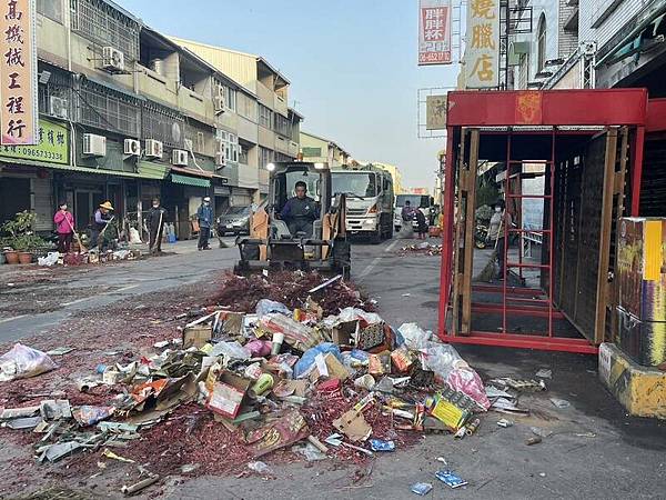 〔記者蔡文居/台南報導〕台南市元宵夜鹽水蜂炮及鹿耳門聖母廟施放高空煙火活動,激情過後遺留大量炮屑及垃圾。台南市環保局25日清晨調派超過300名清潔人員及車輛機具進駐,展開環境清理工作,迅速恢復市容,其中鹽水蜂炮共清出了28公噸垃圾,比去年23公噸還要多。