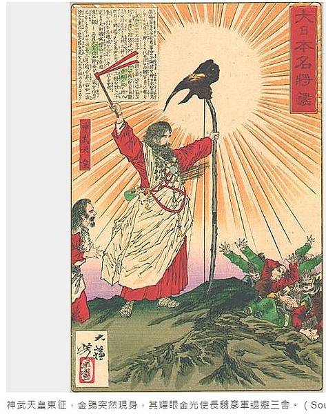 神武天皇東征,金鵄突然現身,其耀眼金光使長髓彥軍退避三舍。(Source:Wikipedia)