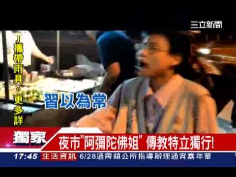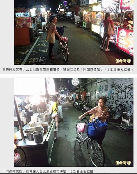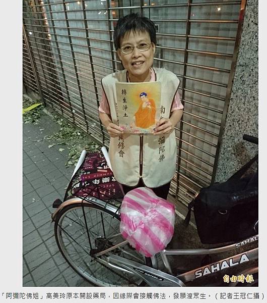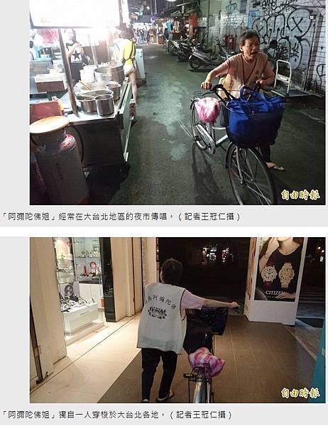 〔記者王冠仁/台北報導〕她,騎著腳踏車,穿梭在大台北各夜市,給人的第一印象,就是中氣十足的「阿彌陀佛歌聲」。不少人以為她是「趴待」,甚至對她的「佛音貫腦」不堪其擾、惡言相向;但也有人認為她執著得很可愛,還會對她「點歌」,要她唱出各種版本的阿彌陀佛歌。這名被網友封為「阿彌陀佛姐」的高美玲,一唱將近20年,宛如「地獄不空、誓不成佛」的現代地藏王菩薩,不僅想成佛,也想渡眾生。