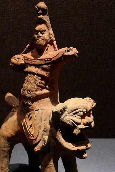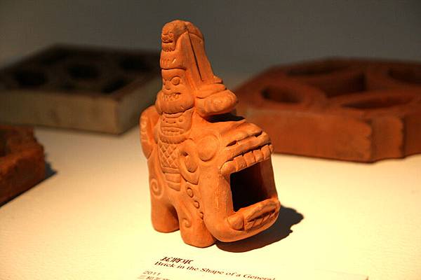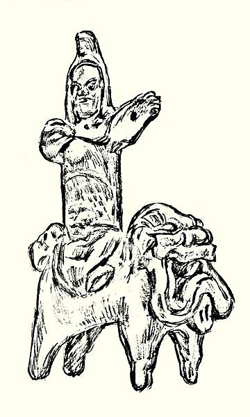 國立歷史博物館藏品,登錄號089-00109,品名「風獅爺」,尺寸16×10×29.5公分,紅素陶質,武將戴盔作拉弓狀,坐騎開口,下顎作W形,尾巴蓬厚,箭袋置於背上,整體造形偏近獅形。(筆者繪)