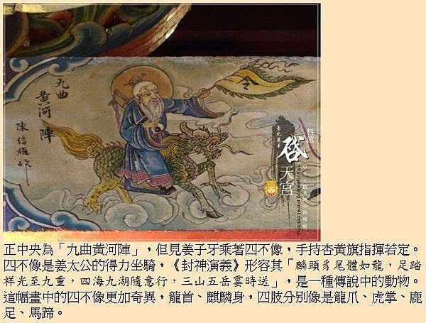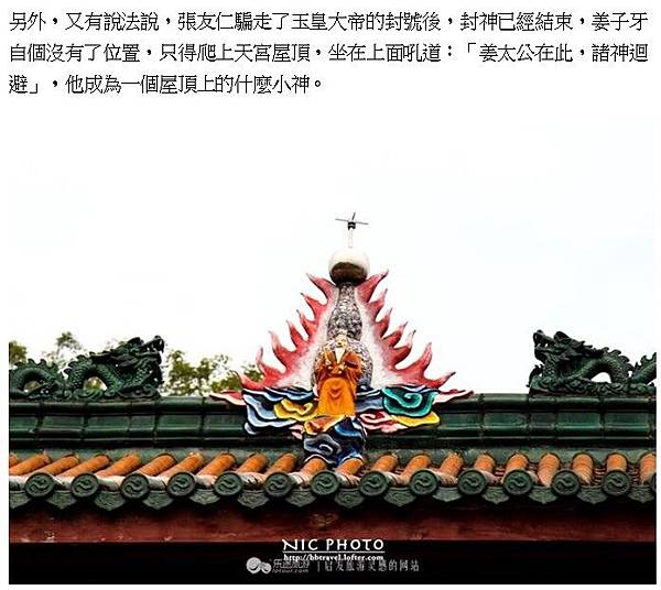 後來各地蓋廟時,在殿頂上,塑上太公爺爺,有的身穿官履正面端坐、有的身穿道服、有的乘四不像、背打神鞭、有的手執黃旗,也有的頂盔貫甲,罩袍束帶、將帥打扮,總之都是太公在此,萬事大吉。