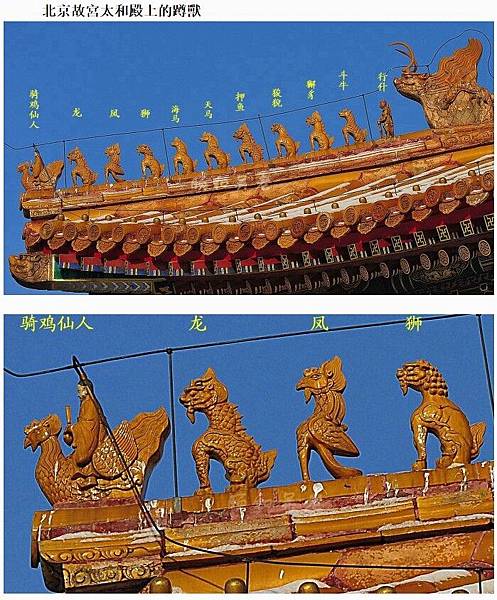 大家知道在清代,建築的屋頂上的脊獸是有嚴格的等級限制的,尤其蹲獸(跑獸、小跑)在排列上和數量上都有規定,如北京故宮太和殿為等級最高,上有十個蹲獸(其它均為奇數),在“騎雞仙人”之後分別是:龍、鳳、獅、海馬、天馬(海馬和天馬可以互換)、押魚、狻猊(狻猊押魚和狻猊也可以互換)、獬豸、鬥牛和行什(一龍二鳳三獅子,海馬天馬四押魚,狻猊獬豸九鬥牛,第十行什像隻猴)。