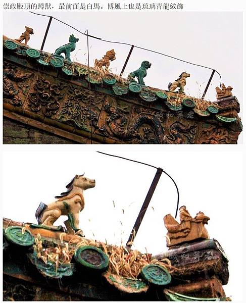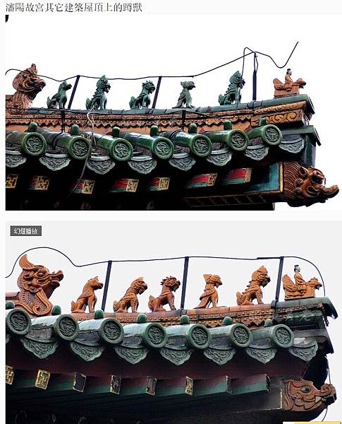 但是瀋陽故宮崇政殿陽面屋頂蹲獸“騎雞仙人”後第一個蹲獸分別是“羊”和“馬”,而且有清以來對瀋陽故宮也進行了多次擴改建,包括現代維修也沒有改變屋頂蹲獸的樣子,但是其他殿宇基本上都是按照《大清會典》規制安放的蹲獸。