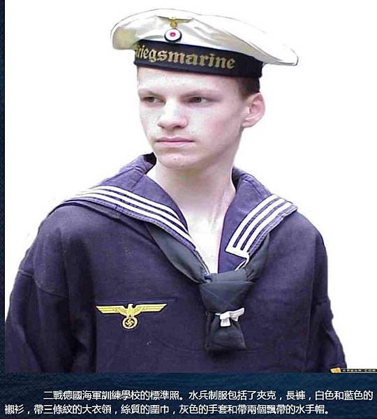 圖為二戰德國水兵威利·雅各布斯在海軍訓練學校的標準照。水兵制服包括了夾克,長褲,白色和藍色的襯衫,帶三條紋的大衣領,絲質的圍巾,灰色的手套和帶兩個飄帶的水手帽。