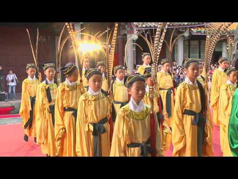 下午15時整,釋奠典禮隆重開啟,來自日月潭當地魚池鄉64名學生,頭戴明式皂巾,身著淺黃色與綠色袍服,搭配黑靴,排成八行八列組成方陣形,為來自山西的祖廟聖像獻上隆重的“八佾舞”。