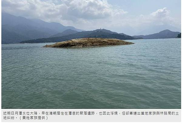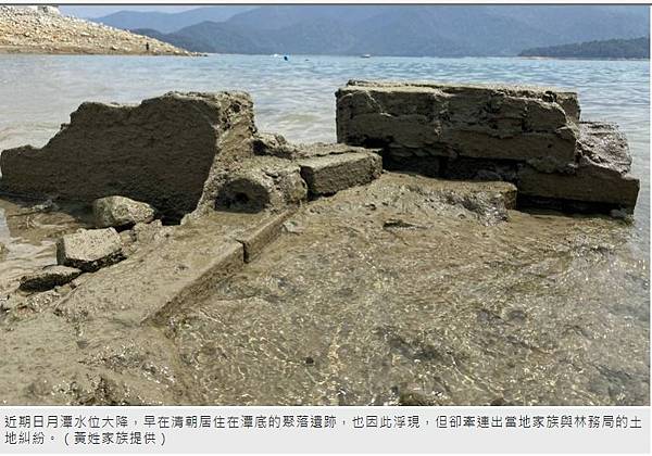 近期日月潭水位大降,早在清朝居住在潭底的聚落遺跡,也因此浮現,但卻牽連出當地家族與林務局的土地糾紛。(黃姓家族提供)