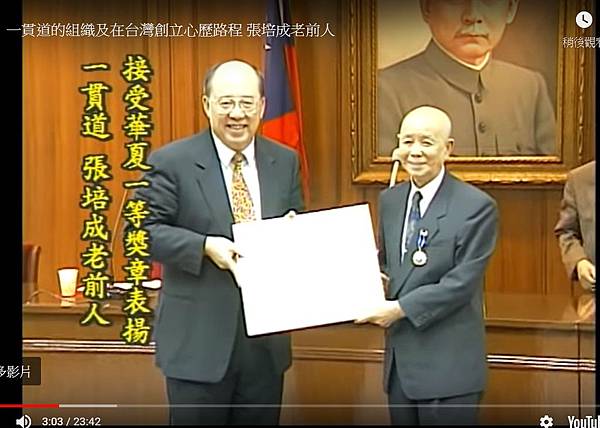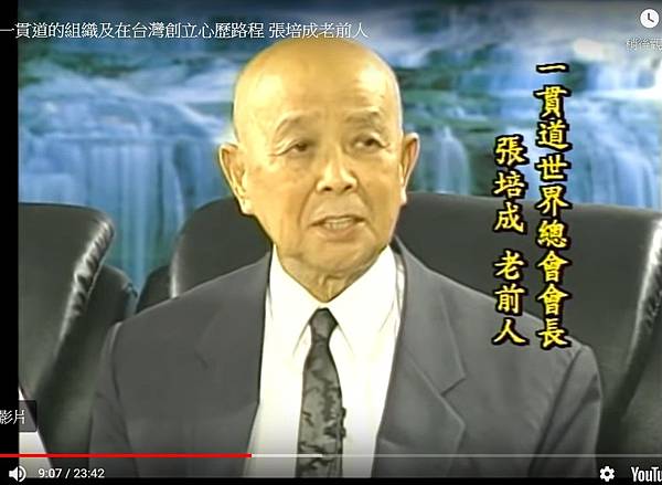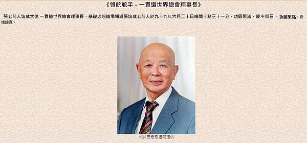 張培成老前人於1996年創立一貫道世界總會,並任第一任一貫道世界總會理事長,於2010年6月20日成道卸任。謹於此恭錄2010年7月基礎忠恕道務中心所編撰的「領航的舵手 張培成老前人(1914-2010)生平道範」,以誌張理事長一生修辦道志德行。首任理事長簡介 | mysite-Chinese https://bit.ly/3qvoyDL