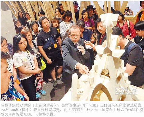 由旺旺集團時藝多媒體主辦的「上帝的建築師:高第誕生165周年大展」,昨(12)日現任聖家堂建造總監約爾迪‧法利(Jordi Fauli)來到台灣,親自為民眾導覽建築奇才安東尼·高第的建築,「高第在100多年前就明白,未來某天,來自世界各地的人都會為了看聖家堂來到巴塞隆那。或是像這個展覽一樣,聖家堂也會走到世界各地,與大家相見。」