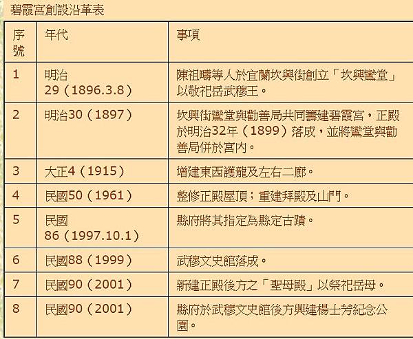 碧霞宮,又名岳武穆王廟,於西元一八九四年,中日甲午戰之後,清朝將臺灣割讓給日本,宜蘭地方士紳深感被外族統治之恥,乃藉建廟為團結聚會的場所,由開蘭進士楊士芳與陳祖疇等人發起,先於西元一八九五年結會,翌年三月八日在宜蘭坎興街創立「碧霞宮鸞堂」,為掩日本人耳目,取「碧血丹心望曉霞」之意,取名碧霞宮,即碧霞宮之由來。