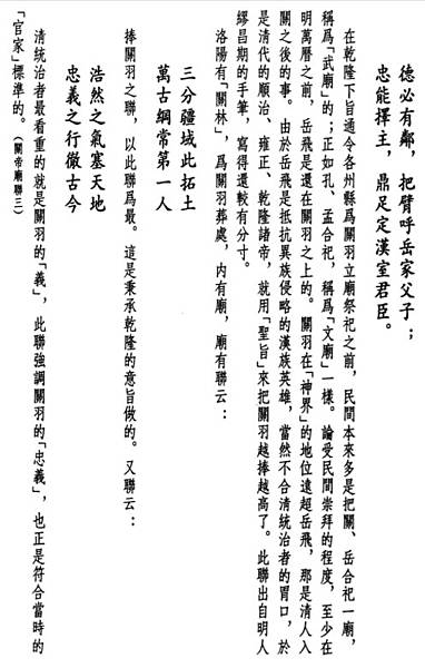 清代乃異族之統治者,對關帝之忠君義膽、情有獨鍾,其無傷於族群殺戮之情懷,更為矚目;而且,無論都市鄉村,只要人煙所至,都有關帝廟之奉祀。無形中,有清一代,武廟之祭祀,自然轉移至關帝廟為之,奉關羽為『武聖』。