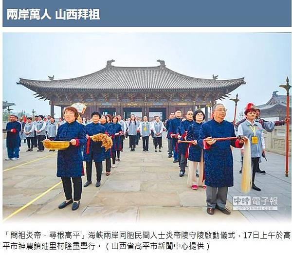 「問祖炎帝.尋根高平」戊戌年海峽兩岸同胞神農炎帝故里民間萬人拜祖典禮21日在山西高平炎帝陵舉行。此次拜祖典禮邀請台灣同胞、海外僑胞與學者專家等和當地群眾近萬人,現場共同祭拜始祖神農炎帝,頌揚炎帝文明。感恩之餘,也盼通過兩岸經濟文化交流,弘揚中華文化。