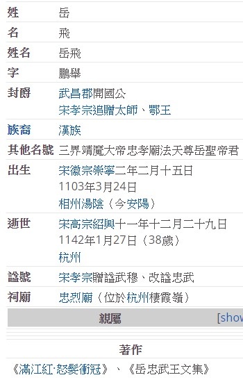 岳飛這個人,30 年前的歷史課本「可能」有提到,但是記憶久遠,難以考究。就算有提到,大概也就是一段,也可能就是與宋高宗、秦檜相關,談的故事不外乎就是要收復舊山河,但被奸臣秦檜所害。其他部分,大概都是中國民間故事看到的,與歷史課本真的一點關係也沒有。