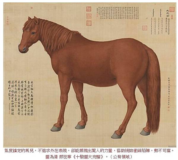氣度鎮定的馬兒,不追求外在表現,卻能展現出驚人的力量,協助統帥衝鋒陷陣,勢不可擋。圖為清 郎世寧《十駿圖大宛騮》----LINK--------。(公有領域)