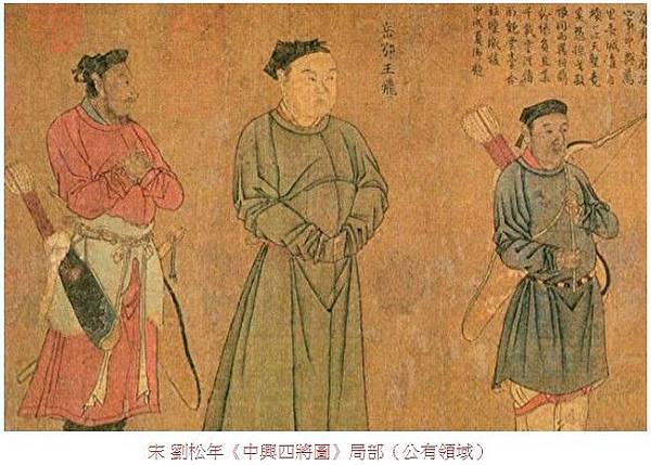 南宋劉松年所作的「中興四將」圖(劉光世、韓世忠、張俊、岳飛全身立像)。岳飛為左起第二個。[25]