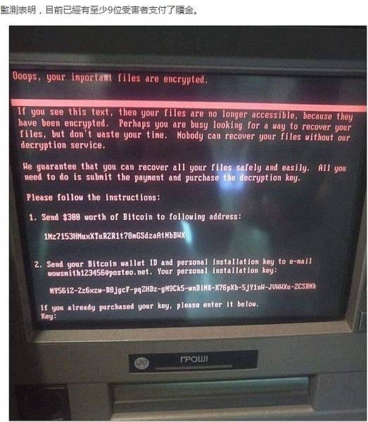 烏克蘭首都基輔,ATM 畫面出現遭到勒索的畫面,無法正常運作;而 120 多公里遠外的工廠,工人們則是被迫手動使用監測輻射裝置在老舊的車諾比輻射工廠進行檢測。更嚴重的問題還是在於許多公家機關甚至政府組織的電腦也已經遭受攻擊,「我國的基礎建設部、負責電信服務的 Ukrtelecom、以及郵局等單位都已經遭受這起勒索病毒影響。」