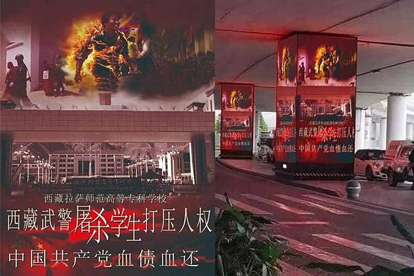 據圖片所示,匿名者攻擊了疑似機場的電子看板,看板上寫著「西藏武警虐殺學生打壓人權、中國共產黨血債血還」,上方還有著事件示意圖。