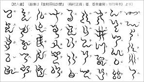 呂應鐘先生將近二十五年前曾經送我一本日本古傳的「神代文字」影本,因為知道我也研究文字學,希望我看看能不能有什麼發現;我研究比對了很久,唯一的發現就是非常像我們商朝的「金文」(鐘鼎文、籀文,或稱大篆),加上蝌蚪文的綜合體;跟後來的日文完全不同,我很懷疑那是「金文」或「蝌蚪文」的前身;而且非常像「符」文。(註:我個人推測,有可能是徐福帶去日本的,因為徐福是方士,就是現代俗稱的法師或道士,他應該懂得這種符文,並且有書簡;而中國本身的也許是在秦始皇統一文字、焚書坑儒時銷毀了,殘留民間的極少數孤本後來也失傳了。)