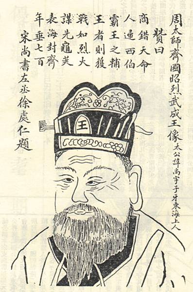 由於姜子牙在興周滅商中建有殊功,武王姬發把薑子牙封到了齊地,成為周代齊國始祖。姜子牙勵精圖治,終將齊國治理成為春秋戰國時期五霸七雄中的強國之一而由於姜太公的雄才偉略更被後人稱為中國謀略家的開山鼻祖司馬遷就曾說後世之言兵及週之陰權皆宗太公為本謀。”(《史記·齊太公世家》) 在我國著名神話小說封神演義中,說姜太公曾在崑崙山從無始天尊學道,後來是奉師命下山輔佐周室的。在起兵伐紂時,也是通過許多道術之士與紂軍鬥法而完成興周大業的。這其實是把薑太公這個歷史人物神化了。