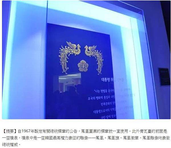 自1967年製定有關總統標章的公告,鳳凰圖案的標章就一直使用。此外青瓦臺的前面是一座噴泉,噴泉中是一座韓國最高權力象征的雕像——鳳凰。鳳凰旗、鳳凰徽章、鳳凰雕像均象徵總統權威。