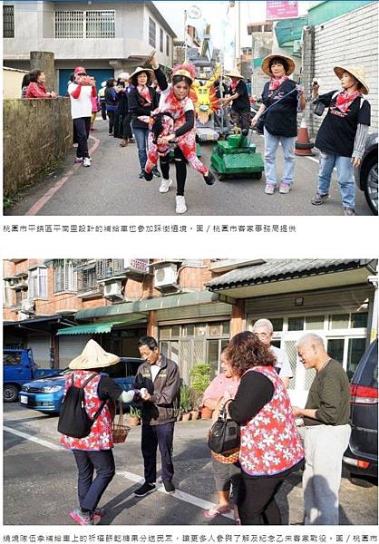 繞境隊伍拿補給車上的祈福餅乾糖果分送民眾,讓更多人參與了解及紀念乙未客家戰役。圖...