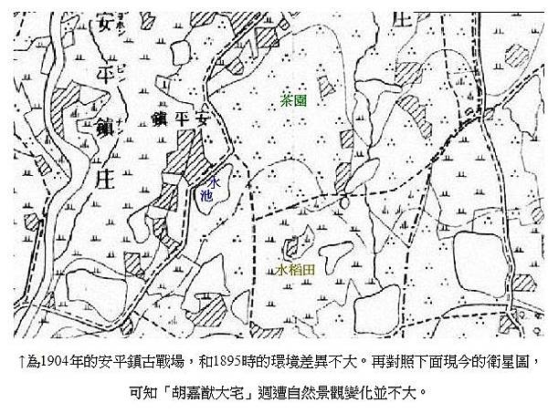 因筆者根據《日清戰史台灣篇》中之〈安平鎮庄之戰鬥圖〉,上中研院GIS編製:「台灣