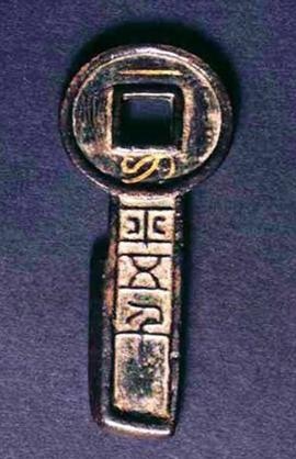 符節在使用過程中遇到的最大問題就是如何防止偽造。因為符節代表著信物,代表著最高的誠信,一旦出現假冒偽造,所產生的嚴重後果不堪設想。把原來竹製的符節改為青銅製的符節,是一種防止偽造的措施;而將青銅符節上刻字改為錯金﹢錯銀圖案,是一種更高級的防止偽造的措施。西漢末期王莽曾經發行過一種錯金“一刀平五千”的刀幣,又被稱為“金錯刀”或“錯刀”,就是使用錯金技術防止偽造。(圖11)實踐證明,在漢代,錯金﹢錯銀工藝,是一種十分有效的防止偽造的措施,因為它的用材質量、精細程度與製作難度,已經大大超出了一般工匠或者家庭作坊的仿製技術和能力,所以這種符節可以放心使用。