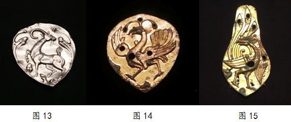 海昏侯墓還出土了另外三套當盧,一套為銀質的,雞心形,有藏羚羊圖案。(圖13)一套為青銅鎏金的,雞心形,有鳳鳥圖案。(圖14)還有一套也是青銅鎏金的,葫蘆形,也有鳳鳥圖案。(圖15)我分析,它們應該也是符節,其檔次則低於錯金﹢錯銀當盧。有藏羚羊圖案的銀質當盧符節,可能是在青藏高原地區使用的;而有鳳鳥圖案的鎏金當盧,可能是在江南荊楚地區使用的。