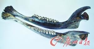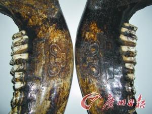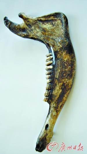 距今5300年至4200年的良渚文化以玉器聞名於世,良渚人全憑手工碾刻在玉器上的神人獸面紋堪稱巧奪天工。近年來刻有良渚文化圖案的骨雕偶有發現。筆者所見兩件牙骨雕是同一動物的下頜骨,長達43厘米,估計是古代野牛的下頜骨,前端8隻小牙已脫落,中間的牙齒保存完整。一側刻有神人獸面紋,另一側刻有數節簡化神人獸面紋,刻畫有神,紋飾精細。
