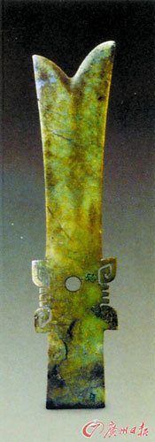 璋是古代玉器的一種,有大璋、中璋、邊璋、牙璋之分,現在一些書籍籠統地把它們稱為牙璋。玉璋是一種刀形端刃器,通常分為體和柄兩部分。玉璋最早出現於山東龍山文化的司馬台遺址,盛行於夏和商代,商代晚期逐漸消失,至今在西周墓葬中從未發現過玉璋。目前可見的玉璋雖然大小不同,形制各異,但其共同點是頂端兩側有尖,尖中間有“凹刃”,在體和柄相接處有突的齒狀扉棱。