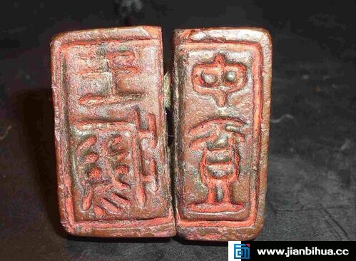 “符”的本意是指用金玉或竹木等材料製成的一種憑證,上面寫有文字,一分為二,君主、朝廷與所派官員各執其一,以便驗證,並在朝廷調兵遣將、傳達命令時使用。如果符的兩半完全對上了,稱為“符合”,表示命令驗證可信,反之則不可行令。《史記·魏公子列傳》中“晉鄙合符,疑之。”《漢書·楚世家》中“齊王大怒,折楚符而合於秦。”都是使用符的例證。近代我國發現的古代虎符的第一件實物是新郪(qi,音期)虎符。據說光緒末年,山東文物商範壽軒在一個渡口旁,看到岸上有幾個孩子玩耍,其中有個孩子用繩子繫著一個金屬玩意兒在地上拖拉著跑在前邊,聲音格外清脆。他追過去撿起來一看,上面雖然沾滿了泥土和鏽跡,但能分辨出是青銅製造的,分量不輕。於是他從孩子們的手裡買下來。後經專家們研究,得知這就是古代的虎符。這件虎符規定,凡用兵在五十人以上,必須使用此符。