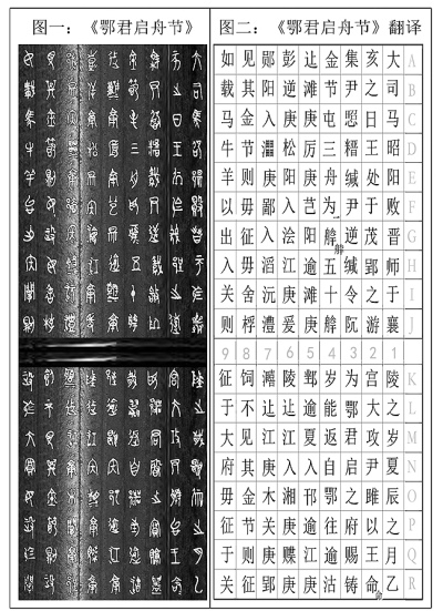 車節銘文:大司馬昭陽敗晉師於襄陵之歲,夏囗之月,乙亥之日,王居於茂郢之游宮。大工尹囗以王命,命集尹囗囗,囗尹逆,囗令阢為鄂君啟之囗囗鑄金節。車五十乘,歲能返。毋載金、革、黽(澠)、箭,如馬、如牛、如特,屯十以當車;車如棓(棒)徒,屯廿廿(二十)棓以當一車,車以毀於五十乘之中。自鄂往,庚昜丘,庚邡城,庚囗禾,庚畐焚(或作埜),庚繁昜,庚高丘,庚下囗(蔡),庚居鄛,庚郢。見其金節毋征,毋舍桴飼,不見其金節則征。