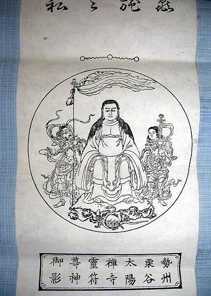 勢州 栗谷 太陽禅寺霊符尊神御影。 頭戴三台星,批髮跣足鎮龜蛇,左右有劍童旗將,是道教常見的玄天上帝畫像。