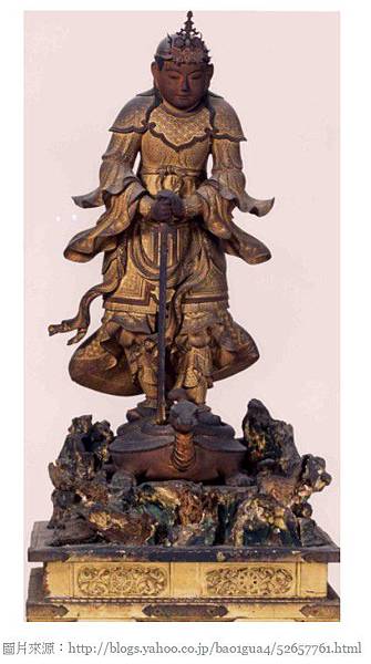 身穿甲冑,腳踏龜蛇,其實是將妙見菩薩與中國道教的玄天上帝混合的結果。