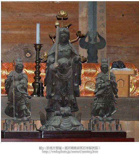 因找不到寺方人員,又不能太過失禮到處拍照,所以只能簡單分享以上所見,希望各位多多包涵!!從現場看來,除了中尊坐姿、舉武士刀的妙見菩薩(圖1)較日式風格外,旁邊各有造型與玄天上帝較雷同的形象(圖2)、(圖3)。
