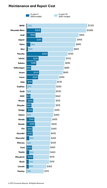 美國相當具權威的《消費者報告 Consumer Reports》調查 32 家車廠,同時針對車主所提供的保養、維修費用進行統計,分別列出 3 年車與 10 年車的每年平均養車成本,數據顯示為 2014 年與 2007 年,其中部分品牌因為停產緣故,沒有 3 年養車成本數據,但仍可以比較 10 年養車成本。