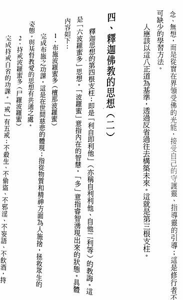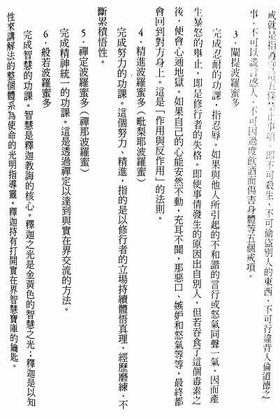 再談六波羅蜜的第二個「持戒波羅蜜」,它關係到不傷害別人,自己也不要受到傷害,這是修行最起碼的基本要件。第三個是「安忍波羅蜜」,告訴我們安忍之餘還要能消化。第四個波羅蜜「精進波羅蜜」:是精進的方法,當然涉及到精進一定要依教如法,如果不好好實踐,也得不到饒益的。第五個是「禪定波羅蜜」,涉及的方法很多,不只是指散亂不散亂的問題!好比:三摩地、三摩缽提、四禪八定、九次第定,甚至禪那的修養,這些都屬於禪定的範圍。再看第六個「慧波羅蜜」,慧的方法,是一般所指般若的方法,奠基於智的基礎上,運作世間的知識經驗,再成為慧的力量。