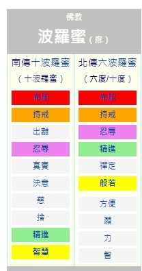 十波羅蜜為六波羅蜜後加了:「方便、願、力、智」四波羅蜜。 南傳上座部佛教亦類似於六波羅蜜的修行法門稱「十波羅蜜多」。 又稱事究竟、到彼岸[2]、度無極、度、波羅蜜、波羅蜜多、播羅弭多、 [3] , 謂菩薩從初住至六住位,以多修習善修習「布施、持戒、忍辱、精進、禪定(靜慮)、智慧」六度萬行為筏,度脫於生死苦海,得至究竟涅槃之彼岸。[4][5]。