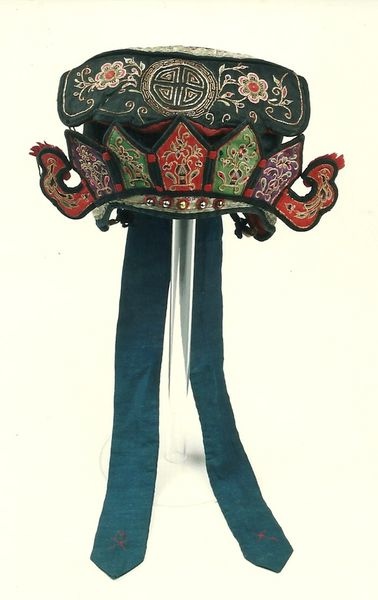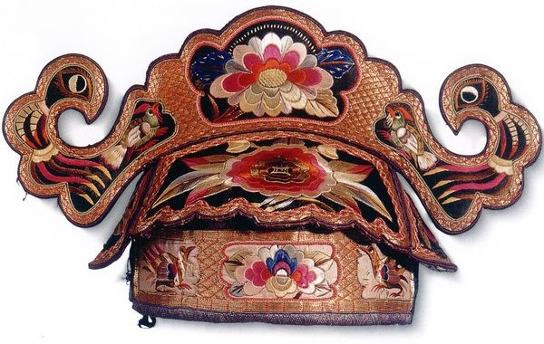 仍是繡有一對公雞和牡丹花。這種造型的帽子,更像戲曲裡小生的帽子。