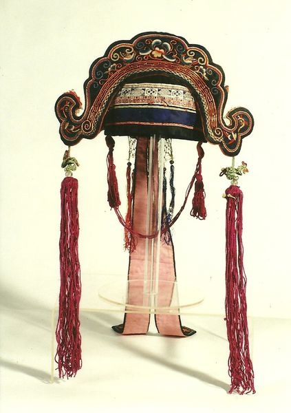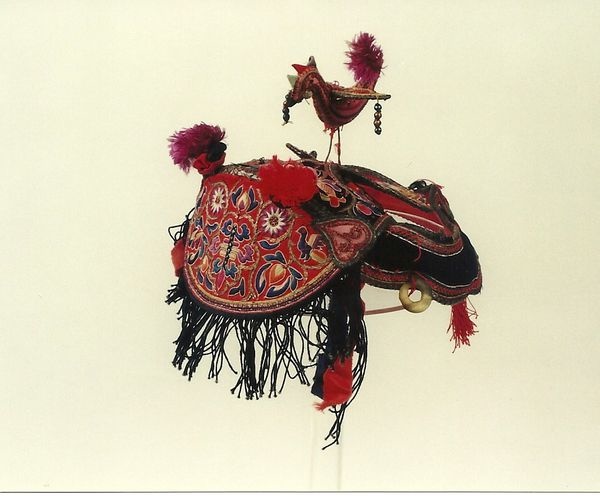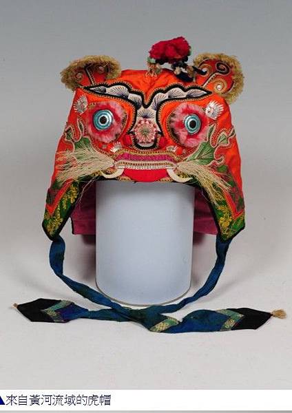 (圖二)台中東勢客家的童帽。帽子前面兩端的鳥頭,上面有紅色的雞冠